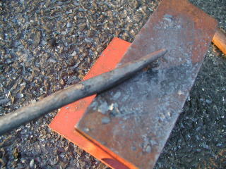 熱いうちにアンビル(鉄道のレールを切ったもの)に載せてトンテンカンテン!